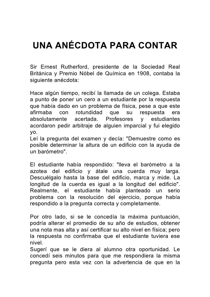 La anécdota se basa en hechos reales, ilustra aspectos poco conocidos de la vida de un personaje famoso o,por el contrario ,revela momentos claves en la biografía de la persona. No tiene un propósito ejemplifica ni es necesario que transmita una enseñanza o valor.